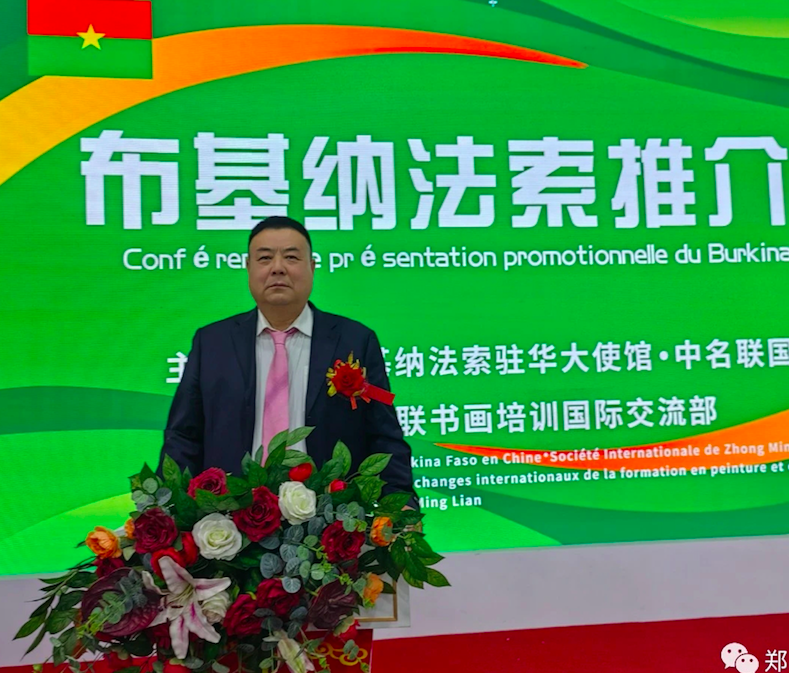 (中名聯(lián)工藝美術(shù)大師培訓(xùn)國(guó)際交流部圖片說(shuō)明:中名聯(lián)集團(tuán)戴本領(lǐng)先生在布基納法索國(guó)家推介會(huì)上發(fā)言。)