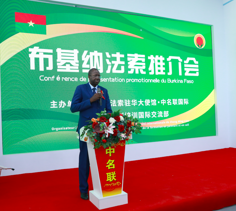 (中名聯(lián)文創(chuàng)園圖片說(shuō)明:布基納法索共和國(guó)駐華大使館領(lǐng)導(dǎo)帕爾﹣伊薩﹣約瑟夫先生上臺(tái)演講,明確表示非常開(kāi)心在中名聯(lián)國(guó)際展廳舉辦布基納法索國(guó)家推介會(huì))