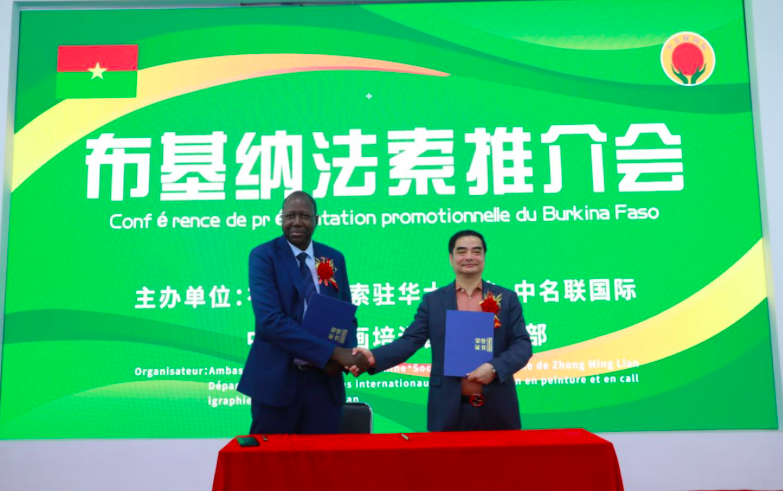 (中名聯(lián)國(guó)際圖片說(shuō)明:布基納法索國(guó)家推介會(huì)上,中名聯(lián)集團(tuán)與布基納法索駐華大使館正式簽屬了合作協(xié)議。)