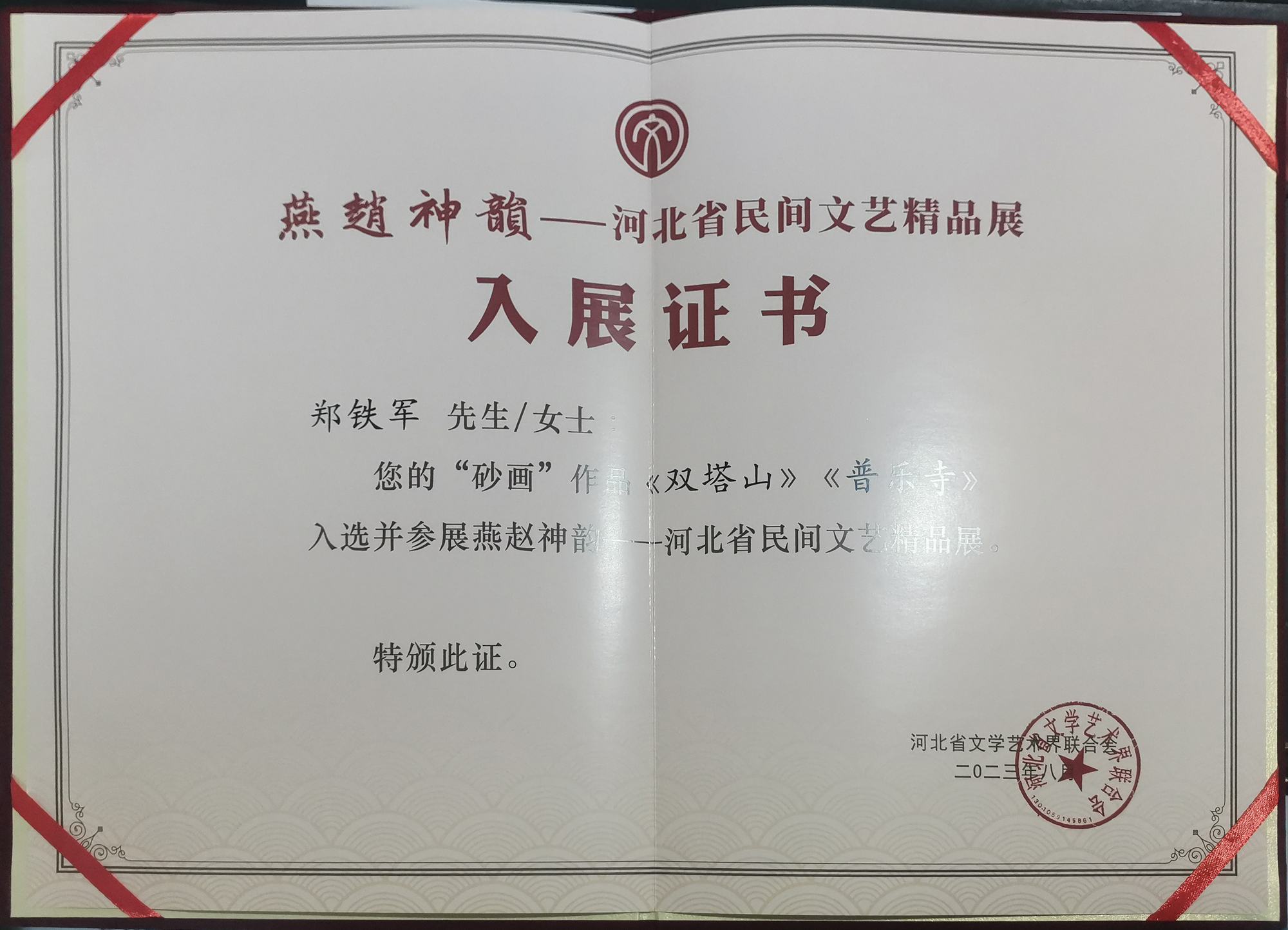 “雙爭”有我進(jìn)行時(shí),鄭氏砂藝(畫)亮相燕趙、再添光彩。2023年伊始,由省委宣傳部、省文聯(lián)主辦的“燕趙神韻”河北省民間文藝精品展在河北省拉開帷幕,鄭氏砂藝以承德避暑山莊景色為主題,創(chuàng)作并報(bào)送了砂畫作品《雙塔山》《普樂寺》。7月,鄭氏砂藝報(bào)送的作品經(jīng)過層層選拔入展了“燕趙神韻”河北省民間文藝精品展。