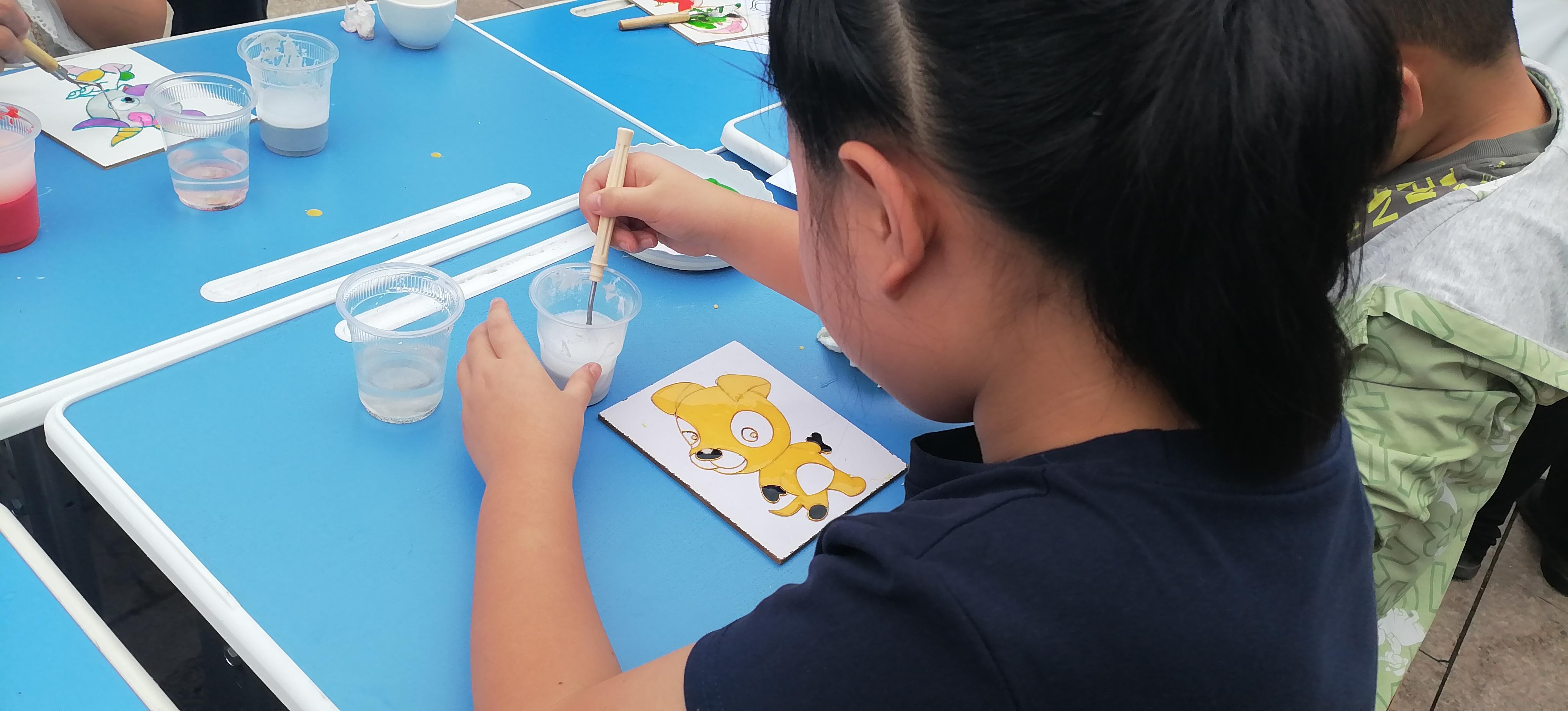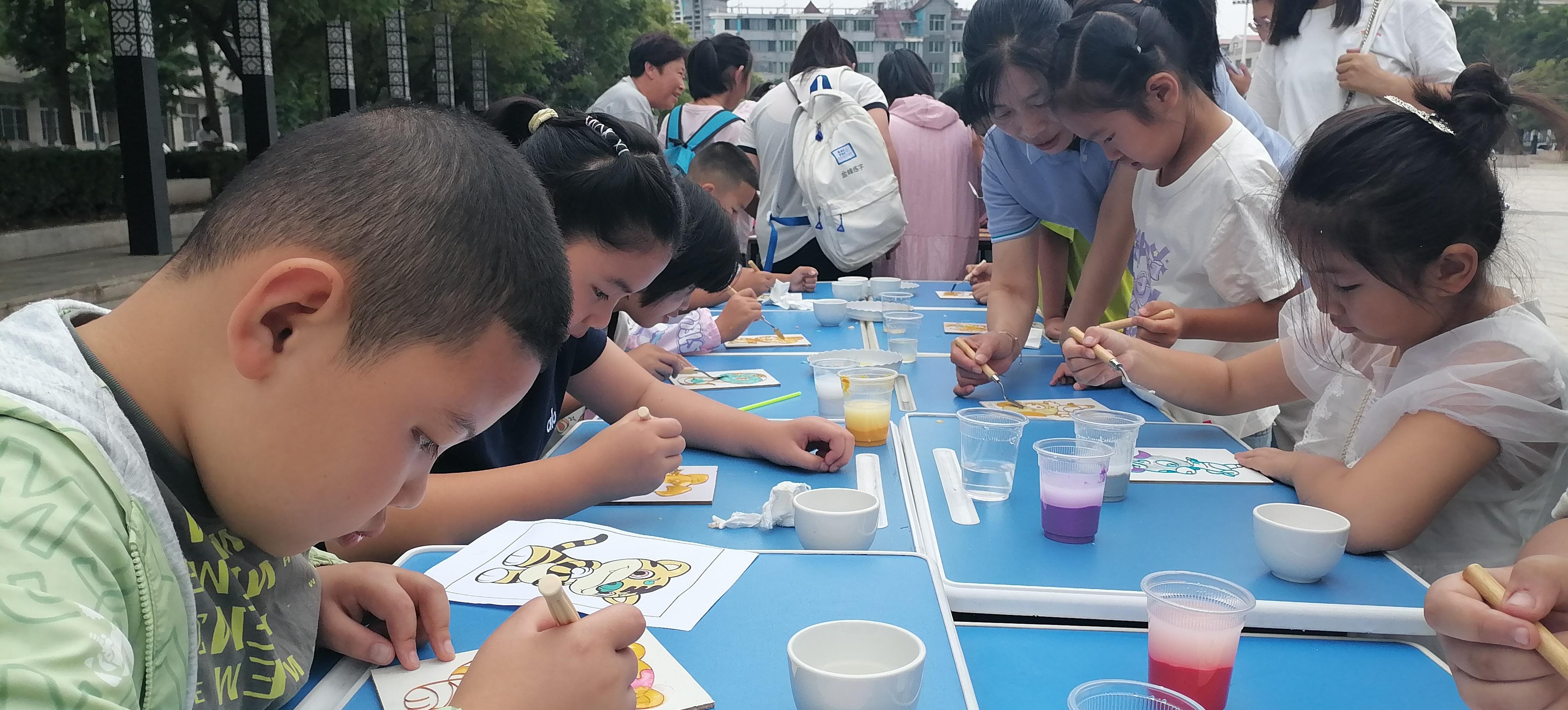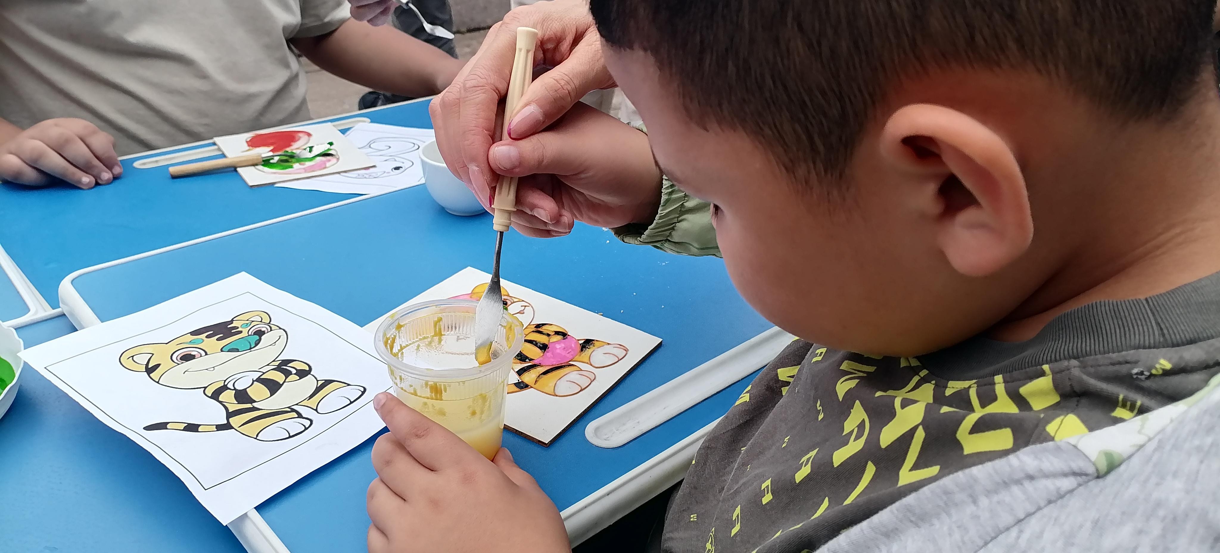 活動現(xiàn)場,鄭氏砂藝的“天然彩砂+金銀絲”工藝成為孩子們的“興趣焦點”。作為興隆縣的省級非遺項目,鄭氏砂藝以天然礦物彩砂為原料,采用金絲銀線勾勒圖案輪廓,再填充彩砂的傳統(tǒng)手法,既保留了鄉(xiāng)土文化特色,又蘊(yùn)含著非遺技藝的巧思。為讓孩子們輕松參與,技師們特意提前制作了粘好金絲的半成品——一幅幅待填充的砂畫作品,將“最精彩的創(chuàng)作環(huán)節(jié)”留給孩子。“我要給小虎的臉涂綠色!”“我喜歡藍(lán)色的眼睛!”孩子們圍坐桌前,手持作畫小鏟,認(rèn)真地將色彩砂石填入金絲框架,同時互相交流“配色秘訣”,現(xiàn)場充滿了童真與熱鬧。