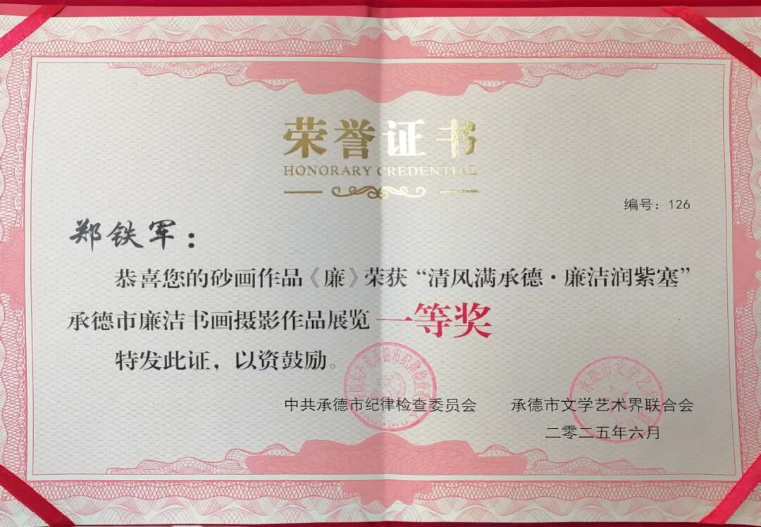 近日,“清風(fēng)滿承德·廉潔潤紫塞”承德市廉潔書畫攝影作品展覽評選結(jié)果揭曉,砂藝創(chuàng)作者鄭鐵軍的作品《廉》榮獲一等獎。該獎項由中共承德市紀(jì)律檢查委員會、承德市文學(xué)藝術(shù)界聯(lián)合會聯(lián)合頒發(fā)。